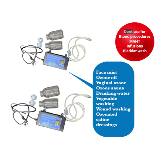 A therapist needs diffusers for the uniform spread of ozone into water for drinking, ozonised water for facial misting, ozonised saline for wound washes and pre-closure washing, and ozonating oils for cosmetic and therapeutic applications.